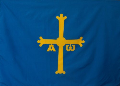 Bandera del Principado de Asturias. «Hoc Sigum tuetur pius. Hoc signo vincitur inimicus» (Con este signo se protege al piadoso, con este signo se vence al enemigo).